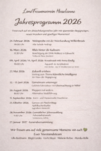 Heute möchten wir euch unser Jahreseprogramm vorstellen und hoffen,viele interessierte Landfrauen bei der Präsentation willkommen heißen zu dürfen. Gemeinsam blicken wir auf ein abwechslungsreiches Jahr voller schöner Begegnungen, spannender Vorträge und gesellige Stunden.