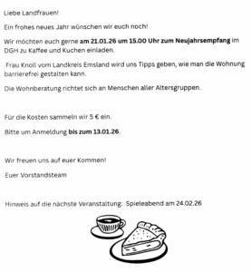 Möchte jemand bei den Jungen Landfrauen eintreten, bitte mit Martina Sicking Kontakt aufnehmen. (0151/62503640) Man kann den JLF auch über Facebook und Instagramm folgen.